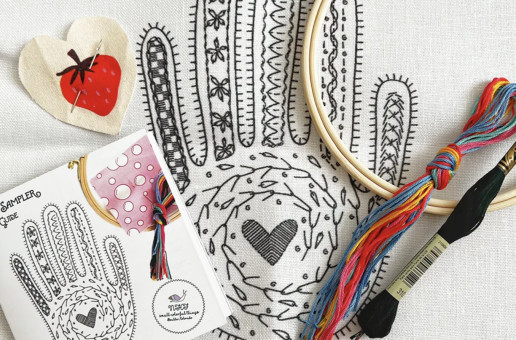 This comprehensive embroidery kit includes a template and required materials, including the hoop and fabric, all stored in a sweet drawstring pouch.
