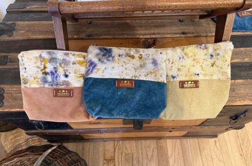 Local fiber artist Molly Dunn of Kelleher's Botanicals hand-dyes fabrics using flowers from local farms to make gorgeous zippered pouches with antique brass zippers.